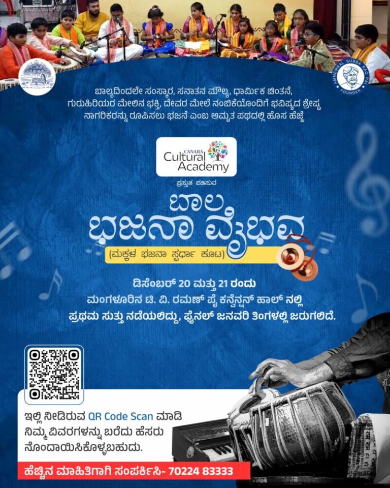 ಮಂಗಳೂರು : ಕೆನರಾ ಹೈಸ್ಕೂಲ್ ಅಸೋಸಿಯೇಶನ್ ಇದರ ಕೆನರಾ ಕಲ್ಚರಲ್ ಅಕಾಡೆಮಿ ಆಶ್ರಯದಲ್ಲಿ ಬಾಲ ಭಜನಾ ವೈಭವ ಸ್ಪರ್ಧಾ ಕಾರ್ಯಕ್ರಮ ಆಯೋಜಿಸಲಾಗಿದೆ. ಡಿಸೆಂಬರ್ 20 ಹಾಗೂ 21 ರಂದು ಈ ಸ್ಪರ್ಧಾ ಕೂಟ ಮಂಗಳೂರಿನ ಟಿ ವಿ ರಮಣ್ ಪೈ ಕನ್ವೆನ್ಷನ್ ಹಾಲ್ ನಲ್ಲಿ ನಡೆಯಲಿದೆ. ಗರಿಷ್ಟ 17 ವರ್ಷ ಮೀರದ ಅಥವಾ ಗರಿಷ್ಟ ಈಗ ಹತ್ತನೇ ತರಗತಿಯಲ್ಲಿ ವಿದ್ಯಾಭ್ಯಾಸ ಮಾಡುತ್ತಿರುವ ಹುಡುಗ/ಹುಡುಗಿ ಇದರಲ್ಲಿ ಭಾಗವಹಿಸಬಹುದಾಗಿದೆ. ಒಬ್ಬ ಸದಸ್ಯ ಒಂದು ತಂಡದಲ್ಲಿ ಮಾತ್ರ ಭಾಗವಹಿಸಲು ಅವಕಾಶವಿದೆ. ಪ್ರತಿ ತಂಡದಲ್ಲಿ ಕನಿಷ್ಟ 8 ಹಾಗೂ ಗರಿಷ್ಟ 12 ಸದಸ್ಯರು ( ಹಾರ್ಮೋನಿಯಂ ಹಾಗೂ ತಬಲಾ ವಾದಕರು ಸೇರಿ) ಇರಬೇಕಾಗಿದ್ದು, ದಕ್ಷಿಣ ಕನ್ನಡ ಹಾಗೂ ಉಡುಪಿ ಜಿಲ್ಲೆಯ ಮಕ್ಕಳು, ಭಜನಾ ಮಂಡಳಿಗಳು ಇದರಲ್ಲಿ ಭಾಗವಹಿಸಬಹುದು.