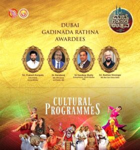 ಸಂಜೆ 4 ಗಂಟೆಗೆ ಸಾಂಸ್ಕೃತಿಕ ಕಾರ್ಯಕ್ರಮಗಳ ಉದ್ಘಾಟನೆ ಹಾಗೂ ಸಾಧಕರಿಗೆ ಗೌರವ ಸನ್ಮಾನ ನಂತರ ಯುಎಇಯ ಪ್ರಸಿದ್ಧ ನೃತ್ಯ ತಂಡದವರಿಂದ ನೃತ್ಯ ವೈಭವ,ಗಾಯಕ ಗಾಯಕಿಯರಿಂದ ಸಂಗೀತ ಸುಧೆ,ಯಕ್ಷಗಾನ ಅಭ್ಯಾಸ ಕೇಂದ್ರ ಯುಎಇ ತಂಡದವರಿಂದ ಗಡಿನಾಡ ಯಕ್ಷ ಕವಿ ಪಾರ್ತಿಸುಬ್ಬ ವಿರಚಿತ ಶ್ರೀ ಕೃಷ್ಣ ಬಾಲಲೀಲೆ ಯಕ್ಷಗಾನ ಪ್ರದರ್ಶನಗೊಳ್ಳಲಿದೆ.