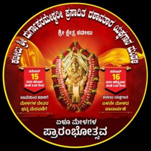 ಕಿನ್ನಿಗೋಳಿ : ಶ್ರೀ ಕಟೀಲಿನ ಏಳನೆಯ ಮೇಳದ ಉದ್ಘಾಟನಾ ಸಮಾರಂಭದ ಅಂಗವಾಗಿ ನಡೆದ ಸಮಾಲೋಚನೆ ಸಭೆಯಲ್ಲಿ 7ನೇ ಮೇಳದ ಪ್ರಾರಂಭೋತ್ಸವದ ಸ್ಟೀಕರ್ ಬಿಡುಗಡೆಯು ಕಟೀಲಿನ ಆನುವಂಶಿಕ ಅರ್ಚಕರಾದ ಶ್ರೀ ವೆಂಕಟರಮಣ ಆಸ್ರಣ್ಣರು, ಶ್ರೀ ಅನಂತ ಆಸ್ರಣ್ಣರು , ಶ್ರೀ ಶ್ರೀ ಹರಿ ನಾರಾಯಣ ದಾಸ ಆಸಣ್ಣರಿಂದ, ಮೇಳದ ಯಜಮಾನರಾದ ಕಲ್ಲಾಡಿ ದೇವಿ ಪ್ರಸಾದ ಶೆಟ್ಟಿ ಹಾಗೂ ಊರ ಅನೇಕ ಗಣ್ಯರ ಸಮಕ್ಷ ಬಿಡುಗಡೆಗೊಳಿಸಲಾಯಿತು.