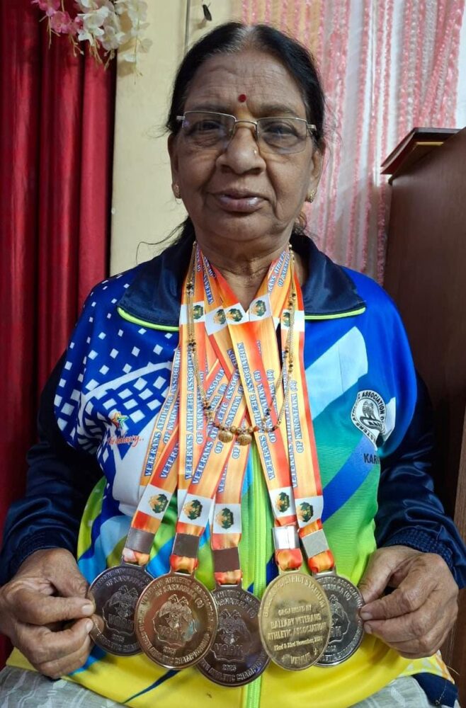 ಧಾರವಾಡ : ವೆಟ್ರನ್ ಅಥ್ಲೆಟಿಕ ಅಸೋಸಿಯೇಷನ್ ಆಫ್ ಕರ್ನಾಟಕ ಹಾಗೂ ಬಳ್ಳಾರಿಯ ವೆಟ್ರನ್ ಅಥ್ಲೆಟಿಕ ಅಸೋಸಿಯೇಷನ್ ಸಂಯುಕ್ತ ಆಶ್ರಯದಲ್ಲಿ ಇತ್ತೀಚೆಗೆ ಬಳ್ಳಾರಿ ನಗರದಲ್ಲಿ ಜರುಗಿದ 45ನೆಯ ರಾಜ್ಯಮಟ್ಟದ ಅಥ್ಲೆಟಿಕ್ಸ್ ಕ್ರೀಡಾಕೂಟದಲ್ಲಿ ಪಾಲ್ಗೊಂಡಿದ್ದ ಇಲ್ಲಿಯ ಚೆನ್ನಬಸವೇಶ್ವರನಗರ ನಿವಾಸಿ, 74 ವರ್ಷದ ನಿವೃತ್ತ ಅಧ್ಯಾಪಕಿ ಚೆನ್ನಮ್ಮ ಹೆಡೆ ಬೈಲೂರ ಅವರು 2 ಚಿನ್ನ ಹಾಗೂ 3 ಬೆಳ್ಳಿ ಪದಕಗಳನ್ನು ತಮ್ಮದಾಗಿಸಿಕೊಂಡಿದ್ದಾರೆ.