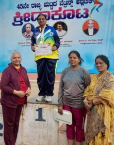 70 ವರ್ಷ ಮೇಲ್ಪಟ್ಟ ವಯೋಮಾನದವರ ತೀವ್ರ ನಡಿಗೆ ಸ್ಪರ್ಧೆಯಲ್ಲಿ 3 ಕಿ.ಮೀ. ಅಂತರವನ್ನು 32 ನಿಮಿಷ 7.5 ಸೆಕೆಂದುಗಳಲ್ಲಿ ಕ್ರಮಿಸಿ ಪ್ರಥಮ ಸ್ಥಾನ ಪಡೆದಿದ್ದಾರೆ. 65 ವರ್ಷ ಮೇಲ್ಪಟ್ಟ ವಯೋಮಾನದವರ ಮಿಕ್ಸಡ ಡಬಲ್ಸ್ 4X100 ಮೀಟರ್ ರಿಲೆ ಸ್ಪರ್ಧೆಯಲ್ಲಿಯೂ ಪ್ರಥಮ ಸ್ಥಾನ ಪಡೆದು ಸಂಭ್ರಮಿಸಿದ್ದಾರೆ. 70 ವರ್ಷ ಮೇಲ್ಪಟ್ಟ ವಯೋಮಾನದವರ ಕಬ್ಬಿಣ ಗುಂಡು ಎಸೆತ ಸ್ಪರ್ಧೆಯಲ್ಲಿ ಹಾಗೂ ಸರಪಳಿಯುಕ್ತ ಕಬ್ಬಿಣ ಗುಂಡು ಎಸೆತ ಸ್ಪರ್ಧೆಗಳಲ್ಲಿ ದ್ವಿತೀಯ ಸ್ಥಾನ ಪಡೆದಿದ್ದಾರೆ. 30ವರ್ಷ ವಯೋಮಾನದ ಹುಡುಗಿಯರ ಜೊತೆ 4X100 ಮೀಟರ್ ರಿಲೆ ಸ್ಪರ್ಧೆಯಲ್ಲಿ ಪಾಲ್ಗೊಂಡು ದ್ವಿತೀಯ ಸ್ಥಾನ ಗಳಿಸಿದ್ದಾರೆ.
