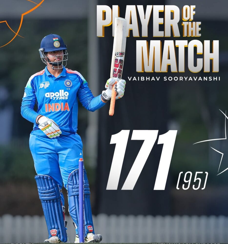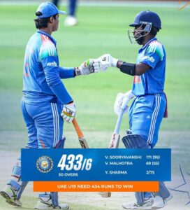 ಟಾಸ್ ಗೆದ್ದ ಯುಎಇ ಮೊದಲು ಬೌಲಿಂಗ್ ಆಯ್ಕೆ ಮಾಡಿಕೊಂಡಿತು.ಭಾರತ ತಂಡವು 50 ಓವರ್ಗಳಲ್ಲಿ 6 ವಿಕೆಟ್ಗಳ ನಷ್ಟಕ್ಕೆ 433 ರನ್ಗಳ ಅದ್ಭುತ ಮೊತ್ತವನ್ನು ಗಳಿಸಿತು, ವೈಭವ್ ಸೂರ್ಯವಂಶಿ ಅವರು 95 ಬಾಲ್ ಗಳನ್ನು ಎದುರಿಸಿ 14 ಸಿಕ್ಸರ್ಗಳನ್ನು ಒಳಗೊಂಡ ಭರ್ಜರಿ 171 ರನ್ ಗಳಿಸಿದರು. ವಿಹಾನ್ ಮಲ್ಹೋತ್ರಾ ಮತ್ತು ಆರನ್ ಜಾರ್ಜ್ ಅವರು ತಲಾ 69 ರನ್ ಗಳಿಸಿದರು. ಯುಎಇ ಪರ, ಯುಗ್ ಶರ್ಮಾ ಅತ್ಯಂತ ಪರಿಣಾಮಕಾರಿ ಬೌಲರ್ ಆಗಿದ್ದರು, ಅವರು 75 ರನ್ಗಳಿಗೆ 2 ವಿಕೆಟ್ಗಳನ್ನು ಪಡೆದರು.