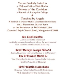 ಮಂಗಳೂರು : ಸೈಂಟ್ ಅಲೋಶಿಯಸ್ ವಿಶ್ವವಿದ್ಯಾಲಯದ ಪರಂಪರೆ ಮತ್ತು ಗುರುತುಗಳನ್ನು ಚಿತ್ರಿಸುವ ದಿ ಎಕೋಸ್ ಆಫ್ ದ ಕಾರಿಡಾರ್ಸ್ – ಎ ಪೋರ್ಟ್ರೇಟ್ ಆಫ್ ಸೈಂಟ್ ಅಲೋಶಿಯಸ್ ಯುನಿವರ್ಸಿಟಿ ಹಾಗೂ ಫಾದರ್ ಮಲ್ಲರ್ ಚಾರಿಟೇಬಲ್ ಇನ್ಸ್ಟಿಟ್ಯೂಷನ್ಸ್ನ ಪರಂಪರೆ ಮತ್ತು ಸೇವೆಯನ್ನು ದಾಖಲಿಸುವ ಟಚ್ಡ್ ಬೈ ಏಂಜಲ್ಸ್ – ಎ ಪೋರ್ಟ್ರೇಟ್ ಆಫ್ ಫಾದರ್ ಮಲ್ಲರ್ ಚಾರಿಟೇಬಲ್ ಇನ್ಸ್ಟಿಟ್ಯೂಷನ್ಸ್ ಎಂಬ ಎರಡು ಕಾಫಿ ಟೇಬಲ್ ಪುಸ್ತಕಗಳ ಕುರಿತು ವಿಶೇಷ ಉಪನ್ಯಾಸ ಕಾರ್ಯಕ್ರಮವನ್ನು ಆಯೋಜಿಸಲಾಗಿದೆ. ಸಂಸ್ಥೆಗಳ ಇತಿಹಾಸ ಮತ್ತು ಮೌಲ್ಯಗಳನ್ನು ಸಂರಕ್ಷಿಸುವಲ್ಲಿ ದೃಶ್ಯ ಕಥನದ ಮಹತ್ವವನ್ನು ಈ ಕಾರ್ಯಕ್ರಮದಲ್ಲಿ ವಿವರಿಸಲಾಗುವುದು.