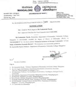 ಮಂಗಳೂರು : ಮಂಗಳೂರು ವಿಶ್ವವಿದ್ಯಾನಿಲಯವು ಅರ್ಥಶಾಸ್ತ್ರ ವಿಭಾಗದಲ್ಲಿ ನಡೆಸಿದ ಸಂಶೋಧನೆಗಾಗಿ ವೆಂಕಟೇಶ ನಾಯಕ್ ಅವರಿಗೆ ಡಾಕ್ಟರ್ ಆಫ್ ಫಿಲಾಸಫಿ (ಪಿಎಚ್.ಡಿ.) ಪದವಿಯನ್ನು ಪ್ರದಾನ ಮಾಡಿದೆ.