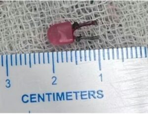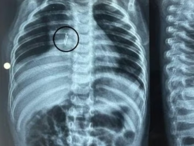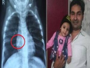 ಚಿಕಿತ್ಸೆಗಳು ವಿಫಲವಾದಾಗ, ಕುಟುಂಬವು ಮಗುವನ್ನು ಗೋತ್ರಿಯಲ್ಲಿರುವ ಸರ್ಕಾರಿ ಆಸ್ಪತ್ರೆಗೆ ಕರೆದೊಯ್ದರು ಅಲ್ಲಿನ ಇಎನ್ಟಿ ತಜ್ಞರು ಪರೀಕ್ಷೆ ನಡೆಸಿದರು ಮತ್ತು ಎಕ್ಸ್ ರೇ ಮಾಡಲಾಯಿತು, ಎಕ್ಸ್-ರೇ ಯಲ್ಲಿ ಶ್ವಾಸನಾಳದಲ್ಲಿ ಸಿಲುಕಿಕೊಂಡಿರುವ ಒಂದು ವಸ್ತುವನ್ನು ಪತ್ತೆಹಚ್ಚಿದರು ಅದನ್ನು ಕೂಲಂಕಷವಾಗಿ ಪರೀಕ್ಷಿಸಿದಾಗ ಸಣ್ಣ ಲೋಹದ ತುಂಡಿನ ಹಾಗೇ ಗೋಚರಿಸಿತು. ಸಂಪೂರ್ಣ ಪರೀಕ್ಷೆ ಮಾಡಿದ ನಂತರ,ಮಗುವಿನ ಶ್ವಾಸಕೋಶದಲ್ಲಿ ಒಂದು ಸೆಂಟಿಮೀಟರ್ ಉದ್ದದ ಎಲ್ಇಡಿ ಬಲ್ಬ್ ಇರುವುದು ಕಂಡುಬಂದಿತು.