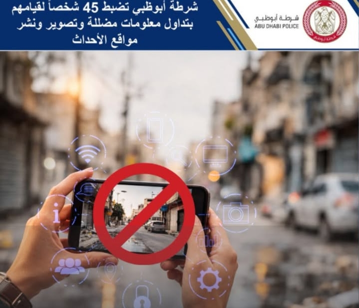 ಅಬುಧಾಬಿ: ಗಲ್ಫ್ ಪ್ರದೇಶದಲ್ಲಿ ನಡೆಯುತ್ತಿರುವ ಉದ್ವಿಗ್ನತೆಯ ನಡುವೆ ಸಾಮಾಜಿಕ ಮಾಧ್ಯಮಗಳಲ್ಲಿ ನಕಲಿ ಸುದ್ದಿ ಮತ್ತು ದಾರಿತಪ್ಪಿಸುವ ಚಿತ್ರಗಳನ್ನು ಹರಡಿದ್ದಕ್ಕಾಗಿ ಅಬುಧಾಬಿ ಪೊಲೀಸರು 45 ಜನರನ್ನು ಬಂಧಿಸಿದ್ದಾರೆ.