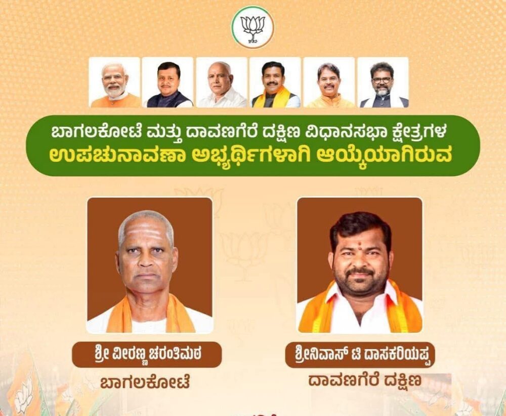 ಬೆಂಗಳೂರು : ಕರ್ನಾಟಕ ರಾಜಕೀಯದಲ್ಲಿ ಕುತೂಹಲ ಕೆರಳಿಸಿದ್ದ ಬಾಗಲಕೋಟೆ ಮತ್ತು ದಾವಣಗೆರೆ ದಕ್ಷಿಣ ವಿಧಾನಸಭಾ ಕ್ಷೇತ್ರಗಳ ಉಪಚುನಾವಣೆಗೆ ಭಾರತೀಯ ಜನತಾ ಪಾರ್ಟಿ (ಬಿಜೆಪಿ) ತನ್ನ ಅಭ್ಯರ್ಥಿಗಳನ್ನು ಅಧಿಕೃತವಾಗಿ ಘೋಷಿಸಿದೆ. ಈ ಘೋಷಣೆಯೊಂದಿಗೆ ರಾಜ್ಯ ರಾಜಕೀಯದಲ್ಲಿ ಉಪಚುನಾವಣೆ ರಂಗ ಮತ್ತಷ್ಟು ಚುರುಕುಗೊಂಡಿದೆ.